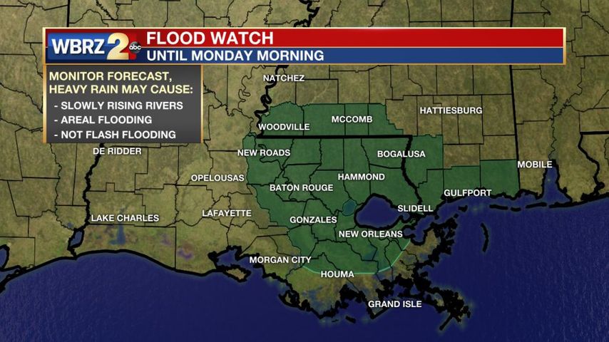 The National Weather Service has issued a FLOOD WATCH for the WBRZ viewing area until Monday morning. A FLOOD WATCH is different than a Flash Flood Watch.