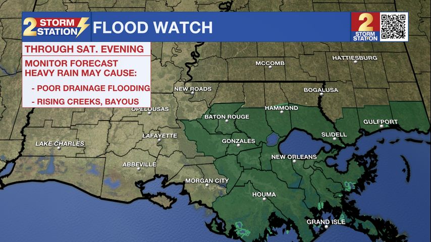 A FLOOD WATCH is in effect for Baton Rouge and areas to the south and east through Saturday Evening. Excessive runoff may result in flooding of small creeks and other low-lying and flood-prone locations. Flooding may occur in poor drainage and urban areas. Storm drains and ditches may become clogged with debris. Monitor the forecast and be alert for possible Flood Warnings. Those living in areas prone to flooding should be prepared to take action should flooding develop.