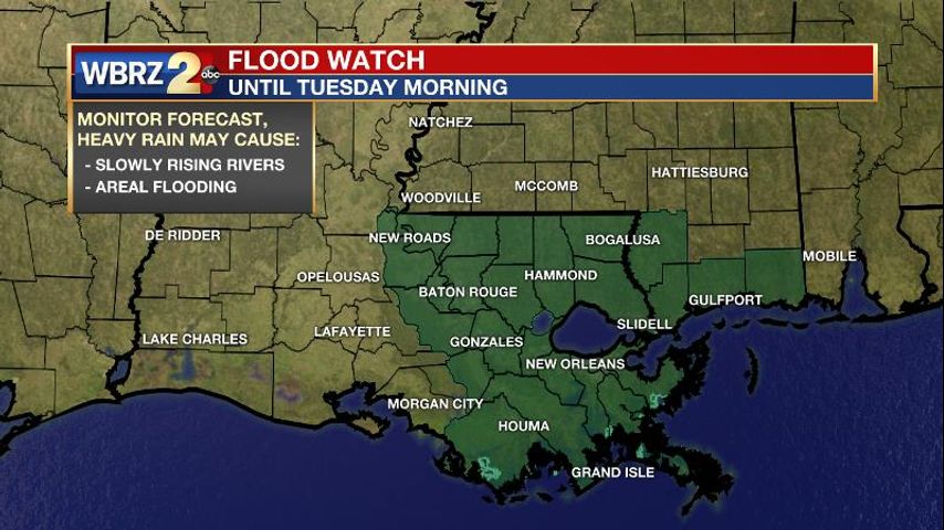 A FLOOD WATCH has been issued for the much of the WBRZ Weather Forecast area until Tuesday morning.The combination of daily showers and thunderstorms and potential impact from Tropical Storm Cristobal will lead to many days when heavy rain will be possible.
