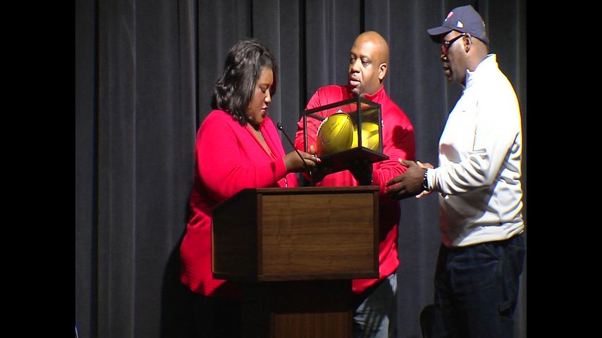 Former Baker High, pro NFL player presents gold football to students