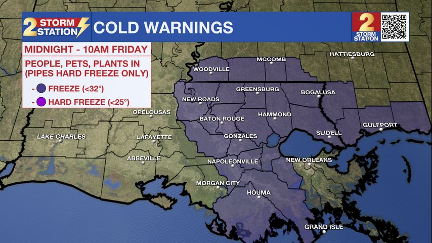 Tonight & Tomorrow: A FREEZE WARNING has been issued for the capital region from Midnight through 10 a.m. Friday. Just about everyone has the potential to hit or drop below 32° on Friday morning. We’re forecasting a low near 31° in Baton Rouge. Factor in a slight NW breeze, and we could see wind chills dip into the 20s at times. Take steps now to protect tender plants from the cold. Also, consider bringing your pets indoors or provide adequate shelter from the cold. Be sure those that have insufficient heating know of warming shelters.