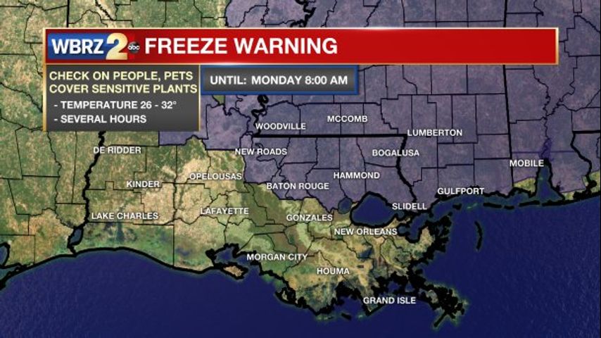 A FREEZE WARNING is in effect for the Florida Parishes, southwest Mississippi, as well as Pointe Coupee and West Baton Rouge parishes.