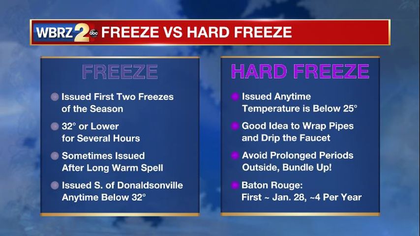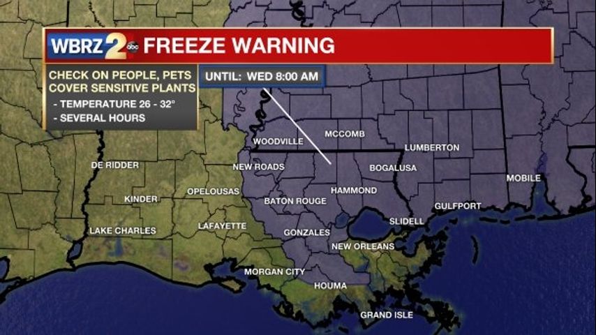 A FREEZE WARNING has been issued for Pointe Coupee, West Feliciana, East Feliciana, St. Helena, Iberville, West Baton Rouge, East Baton Rouge, Ascension, Livingston, Tangipahoa, Assumption and St. James Parishes as well as Wilkinson, Amite and Pike counties until Wednesday morning.