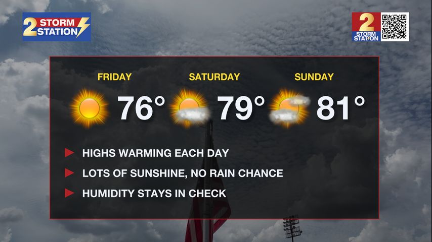 This Weekend: While quiet conditions will persist through the weekend, we will see a slight increase in temperatures and cloud cover each day. Saturday afternoon's high will near 79° while Sunday may warm into the low 80s. We will also see a slight uptick in moisture late this weekend, with a sticky feel returning to the region early next week.