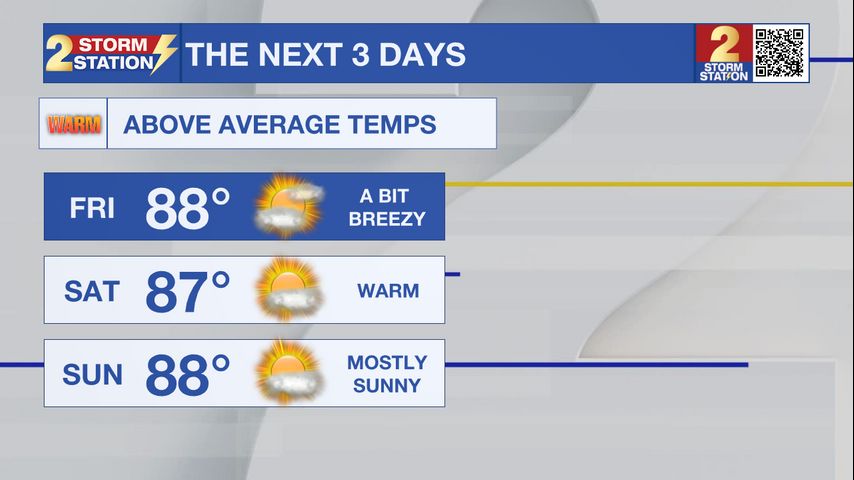 Today & Tonight: We can’t rule out a few areas of patchy fog early this morning. However, a slight breeze does appear to limit any widespread fog, especially near the capital city. Partly sunny skies remain today and temperatures will once again climb into the upper 80s, with enough humidity to make it feel a few degrees warmer. Overnight lows will be slightly cooler in the mid-60s and there is a greater chance to run into fog early Saturday morning.
