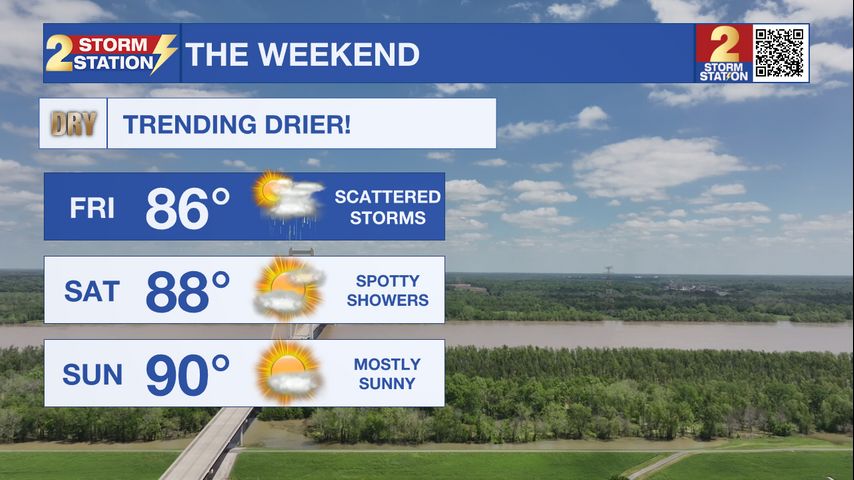 Today & Tonight: Moisture is remaining high in the atmosphere, and this will drive scattered thunderstorms in the afternoon and evening. Gusty winds, and locally heavy rain will be possible with these storms. Those with Friday plans, like heading to cheer on the Tigers at Alex Box Stadium, should closely monitor the forecast. Other than the storms, it will be warm and muggy, with highs in the mid 80s. Overnight, rain will quickly come to an end, with areas of fog possible late.