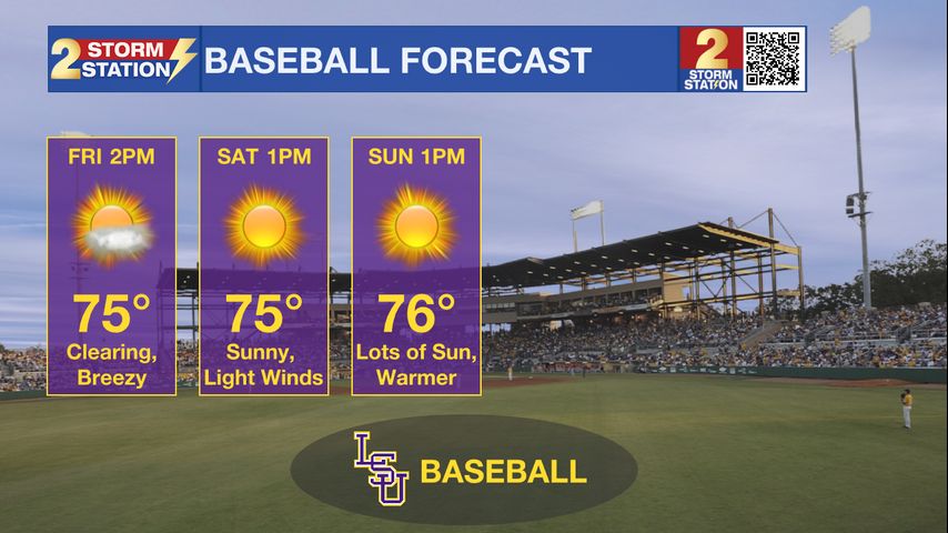 Up Next: After a cool start Saturday morning, temperatures quickly warm into the upper 70s Saturday afternoon. Both Saturday and Sunday will be gorgeous, with plenty of sunshine, low humidity levels, and light winds. Sunday morning also begins with temperatures in the 40s and will become even warmer than the previous day by the afternoon, flirting with the 80° mark! Anyone headed out to Alex Box stadium this weekend will watch the games in close to perfect "baseball weather", don't forget to grab your sunglasses and sunscreen!