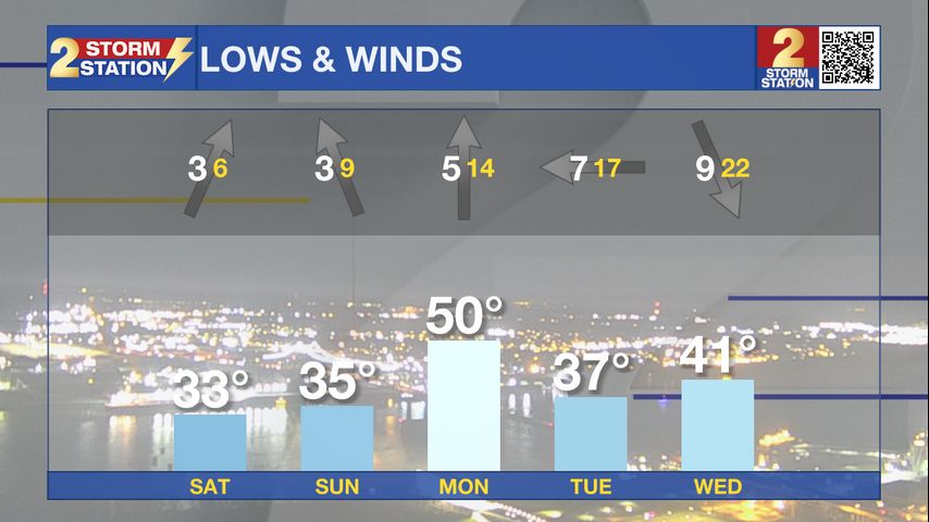 Later in the day, the chill sticks around as temperatures climb into the mid-50s with winds around 5-15mph that create an even colder feel. Plenty of sunshine can be expected and into the overnight clear skies remain. Early Saturday, things stay cold as temperatures hover over the freezing mark once again, 33° expected as the low temperature in the capital city.