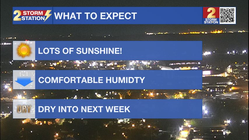 Friday will start off noticeably cooler, with lows in the mid-60s north, upper 60s to near 70 south. Afternoon highs will reach the mid to upper 80s, but with lower humidity, it will feel much more pleasant than earlier in the week. Skies will stay mostly sunny through the day. Tonight, lows will dip back into the 60s under clear skies.