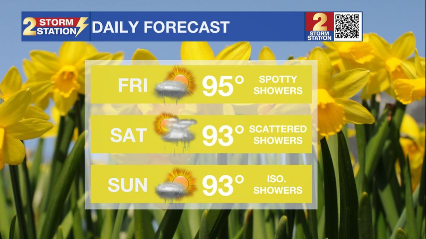 Up Next: Saturday is looking like our wettest day of the weekend. Isolated showers will begin to bubble up just after lunch, becoming more widespread into the afternoon hours. Any rain you see, you should be prepared for possibly stronger storms with gusty winds and hail. This could make for a messy afternoon at Alex box for the Baton Rouge Super Regional. Every afternoon you should expect the low-to-mid 90s, and on the days we see less showers… we could break into the upper 90s. Click here to see the 7-day forecast.