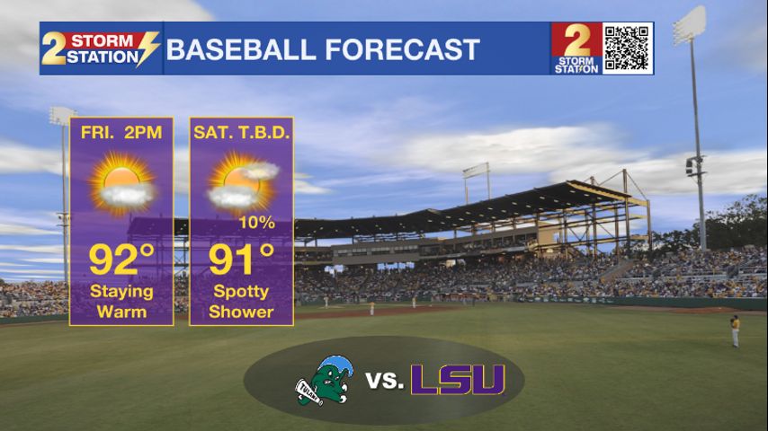 Today & Tonight: Another day with a repeat forecast. Waking up this morning with clear skies and temperatures dipping into the upper-60s. Throughout the day, temperatures will peak in the low-90s. A few spotty showers will bubble up during the afternoon hours but most people will stay completely dry. You LSU baseball forecast is looking HOT but dry.