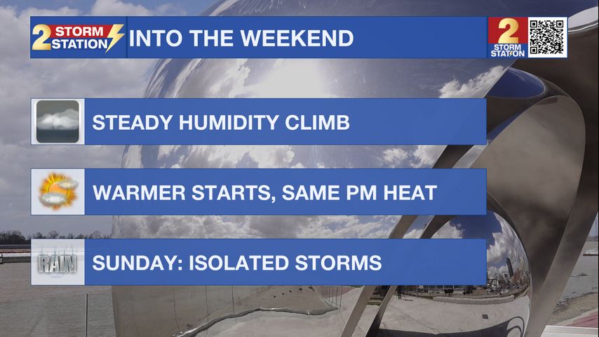 Up Next: The air will hold a stickier feel this weekend due to a gradual return of moisture to the atmosphere. Afternoon highs in the middle 90's in result may feel around 10° warmer at times, but heat alerts remain unlikely. Morning conditions will become a bit muggier as higher morning dew points will limit temperatures from cooling below the upper-70's Sunday morning. Most of the weekend will be filled with sunshine and fair weather cumulus clouds, however; Sunday holds a slightly better rain chance than Saturday. Isolated storms may pop-up during afternoon hours Sunday. We will hold this similar, warm and muggy patter through the last week of the month.