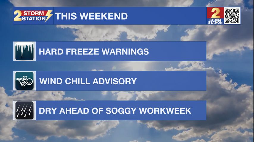 Hard Freeze Warning: Temperatures are expected to dip into hard freeze territory and remain there for multiple hours both Saturday and Sunday mornings. Wrap pipes with foam, newspaper or cloth and lightly drip a faucet overnight. Sensitive vegetation will likely die if not covered or moved inside.