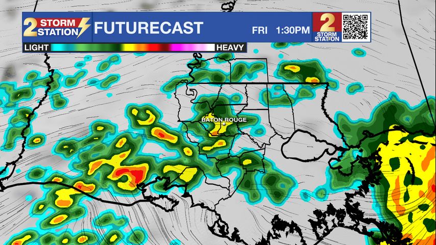 By the afternoon, showers and storms will begin to move into the Capital Area from the south. Scattered storms in an "on-and-off" fashion will be around throughout the day on Friday. The threat for heavy downpours and severe weather, while not completely zero, is less than the past 48 hours. Scattered storm activity will continue into the evening and overnight hours. A final round of widespread storms are set to arrive early Saturday ahead of a cold front that will officially dry us out for a bit. By Saturday afternoon, we could see an additional 1-3" of rainfall accumulation around southern Louisiana.