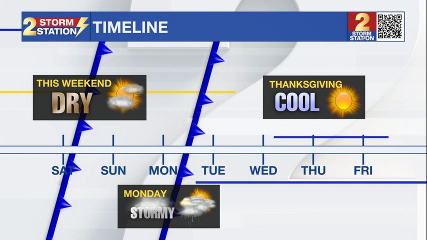 Up Next: Both Saturday and Sunday will be mainly sunny and dry with temperatures in the low to mid 70's. Towards the end of the weekend, clouds begin to build as a the next frontal system nears the state from the NW. A warm front will likely pass early in the day on Monday, and this feature could trigger a few showers. We’ll warm up a fair amount on Monday afternoon, with thunderstorms not out of the question. Then, a strong cold front will arrive on Monday night. This could produce another round of storms, a few of which could be on the stronger side during the afternoon and evening. We are still working out the details on this system, which will become more clear in the days to follow. Keep up to date with the Storm Station for the latest as new data arrives. Behind the front, temperatures will drop off. This will likely set us up for a much chillier Thanksgiving holiday.