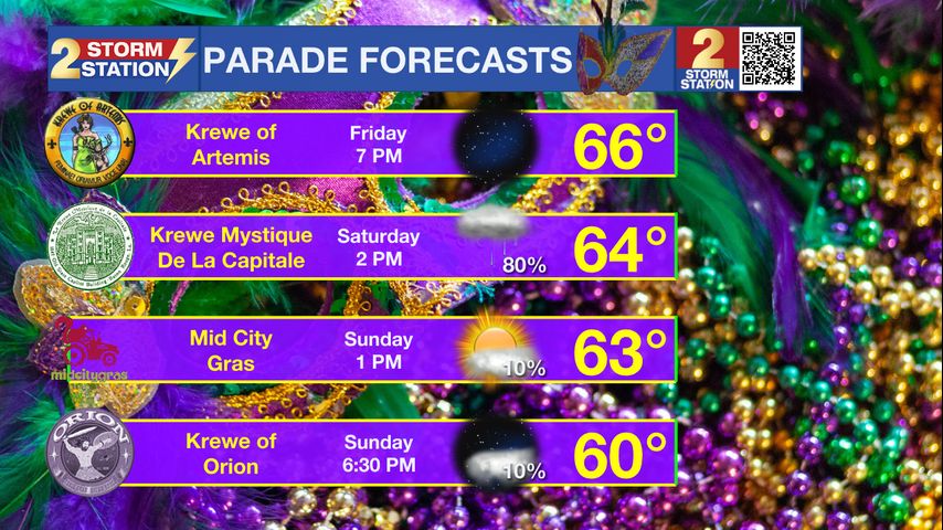Today & Tonight: Clearing skies overnight allowed temperatures to drop into the mid-40s this morning across the state. The chilly start will quickly warm up as mainly sunny skies allow temperatures to climb into the mid-70s Friday afternoon. We remain dry all day and into the overnight so any Friday outdoor plans, including the Krewe of Artemis parade, should have pleasant weather conditions. Cloud cover will gradually increase early Saturday morning ahead of rain. Tomorrow morning, temperatures will be mild, near 50°.