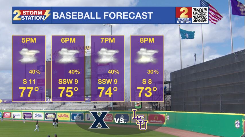 Today & Tonight: A warm and overcast start to Friday hints at the chance for storms later in the day. While some could run into a spotty shower or two during the morning commute, most will stay dry. By lunchtime, when temperatures near 80°, we will begin to see coverage and intensity of showers and thunderstorms increase, especially in northern parishes and Mississippi counties. Although coverage will increase, activity will stay scattered in an "on-and-off" fashion for most. The Capital Area remains under a 2/5 risk for isolated severe storms to develop, with the threats being hail within the storms as well as damaging winds and a small chance of flash flooding. If you are headed out to Alex Box Stadium this evening or have any outdoor activities planned this afternoon, make sure to keep raingear handy and check the radar before stepping outside. As always, if you hear thunder, head indoors, lightning can strike even when you are not directly under a thunderstorm.