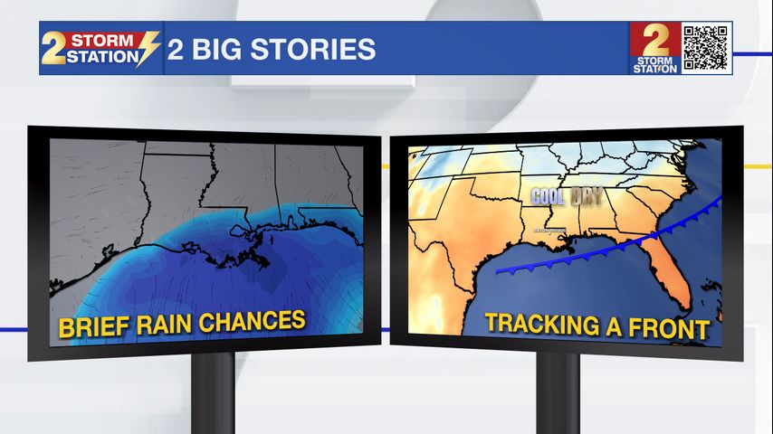 Up Next: The uptick in rain chances will be very brief, and the weekend will trend drier. Spotty showers will be possible Saturday and Sunday, with the best chances south of I-10. For Southern Football, clearing skies are expected by kickoff with a muggy temperature in the low 80s. Temperature wise, the weekend is looking unseasonably warm, with highs near 90 degrees.
