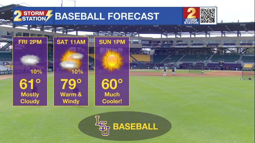 Today & Tonight: Partly sunny skies Friday morning will see an increase in cloud cover by lunchtime. Mostly cloudy skies and cool temperatures in the 60s are to be expected Friday afternoon. Winds will be lighter than on Thursday, out of the east between 5-15 mph. Besides a spotty shower or two, conditions will be dry for those heading out to Opening Day for LSU Baseball or with Valentine's dinner reservations; it is advised to bring an extra layer or two to any outdoor events!