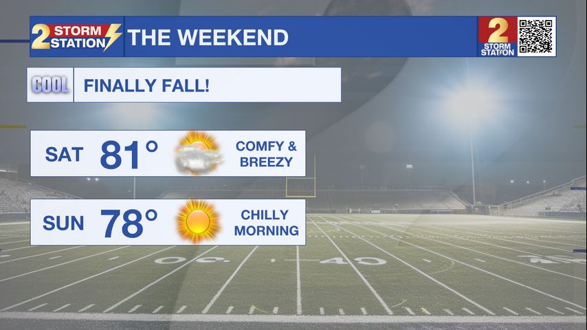 Today & Tomorrow: Muggy air and partly cloudy skies will close the workweek out as highs will be warm in the upper 80s this afternoon. Just enough leftover moisture may aid in the development of spotty showers throughout the day. Later today, a secondary front will swing in from the north which will bring cooler and much drier air to the state. Tonight we will watch temperatures dive into the lower 60s setting us up for a fall like weekend ahead.