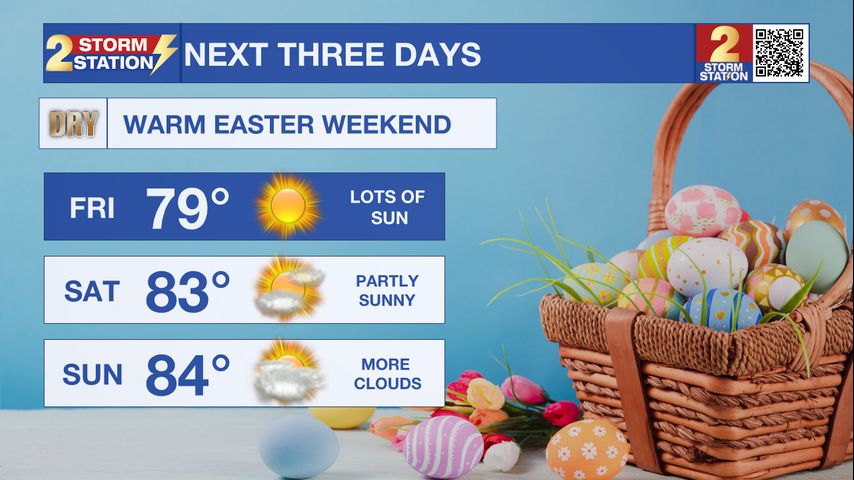 Up Next: A warming trend continues into Easter weekend as southerly winds ushers in warm and moist gulf air. In result, afternoon temperatures Saturday and Sunday will peak in the low 80s with more clouds around. After a mostly cloudy start, Saturday afternoon will feature partly sunny skies. By Sunday, there will be more clouds than sun, keeping temperatures near 60° when headed to early morning Easter Sunday services.