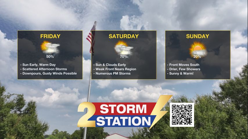 Today & Tonight: Friday will start sunny and warm, with highs in the low 90s. By midday, scattered showers and thunderstorms will begin to develop, influenced by ample moisture in the atmosphere plus a front moving in from the north. Expect hit-or-miss storms through the afternoon and evening, with some heavy rain or gusty winds possible. A few showers may linger overnight before skies turn partly cloudy. Temps dip to the mid-70s by Saturday morning.