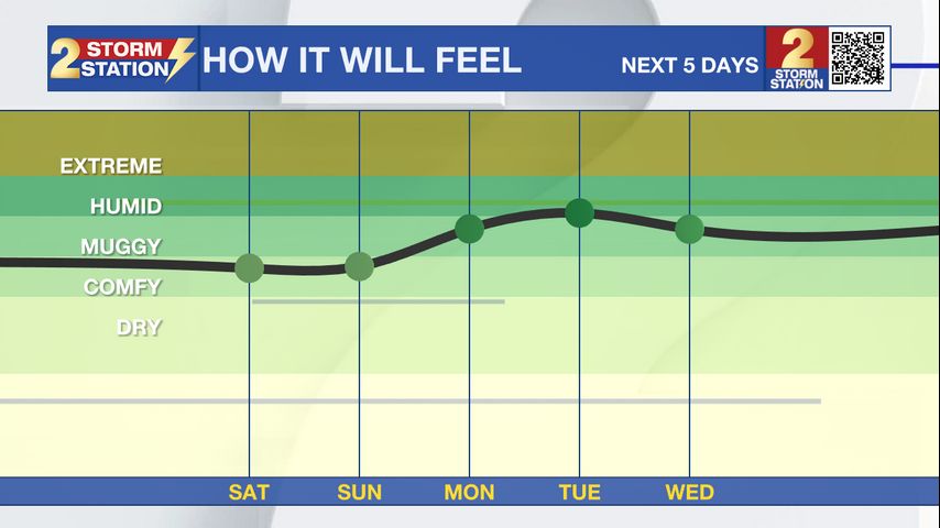 Up Next: Over the weekend, mornings will begin with temperatures in the low 70s followed by afternoons in the upper 80s. Skies will feature a mix of sun and clouds with an outside shot at a shower, mainly on Sunday. Our next best chance of rain will arrive early next week. A front stalled to our northwest, combined with some energy in the upper levels of the atmosphere, could result in scattered showers and thunderstorms to begin the new week. As of right now, severe weather and heavy rainfall do not look like threats. A front passage is unlikely, so the humidity and warm temperatures will not be going anywhere.