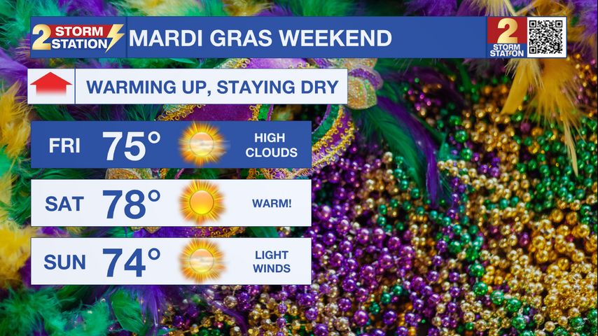 The Weekend: Cool mornings in the 40s will quickly warm each day. Saturday will sport a high near 78° and Sunday near 74°. Both days will feature dry conditions, light winds, and sunny skies; great weather for all Mardi Gras parades!