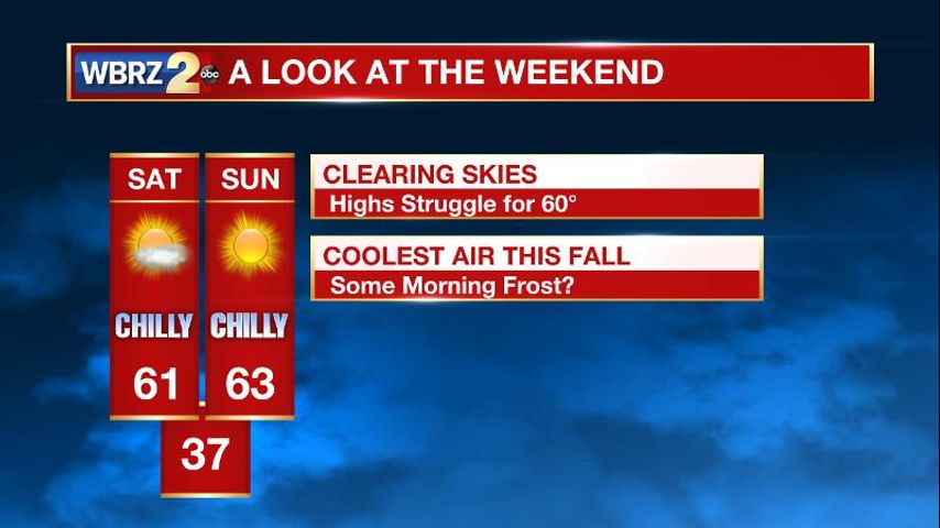 Up Next: Clouds could linger into the first few hours of Saturday and northwest winds will increase to 10-15mph leading to a brisk afternoon. Highs will have difficulty reaching the low 60s. Take layers if you are heading to the Southern Jags game in Little Rock, Arkansas. The kickoff temperature will be around 50 degrees and fall through the 40s during the game! In Baton Rouge, Saturday night lows will dip into the upper 30s. Some frost is not out of the question. After a sunny and cool Sunday, high temperatures will be moderating back into the 70s next week. Right now, Halloween looks sunny and mild with a high in the mid 70s and it will stay clear for evening trick-or-treating.