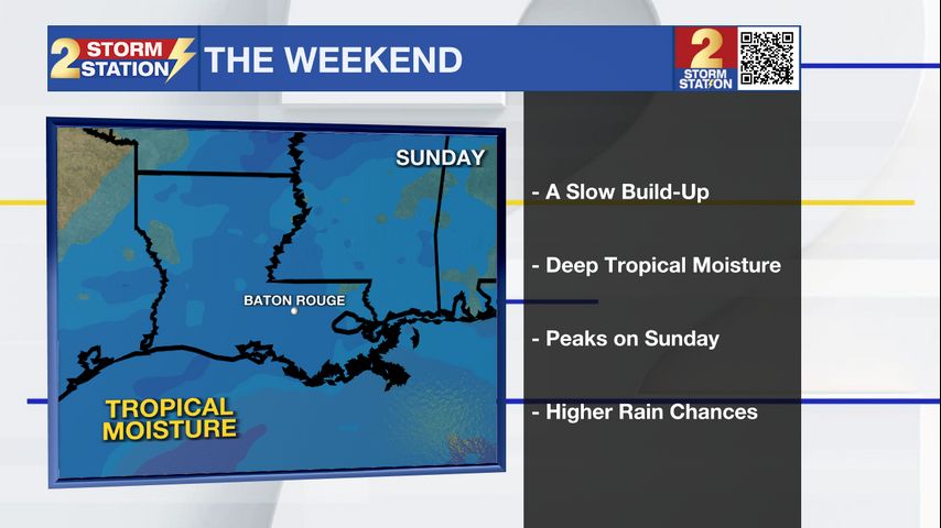 Up Next: A spike in tropical moisture will result in a greater number of storms on Sunday. Numerous showers and storms are expected, and they could kick off a little earlier. Activity appears to start off near the coast during the morning and drift northward with time. The majority will collect a downpour on Sunday. Highs will vary from town to town, nearing 90° in Baton Rouge but likely cooler farther south where rain starts earlier in the day.