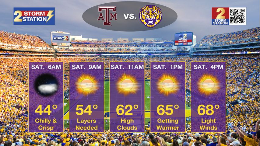 We’ll see more high clouds on Saturday, resulting in filtered sunshine through the day. Despite the chilly start, temperatures warm up nicely. We’re looking at temperatures in the lower-60s at kickoff for LSU’s final home game of the season. Afternoon highs will top out in the upper-60s to near 70°.