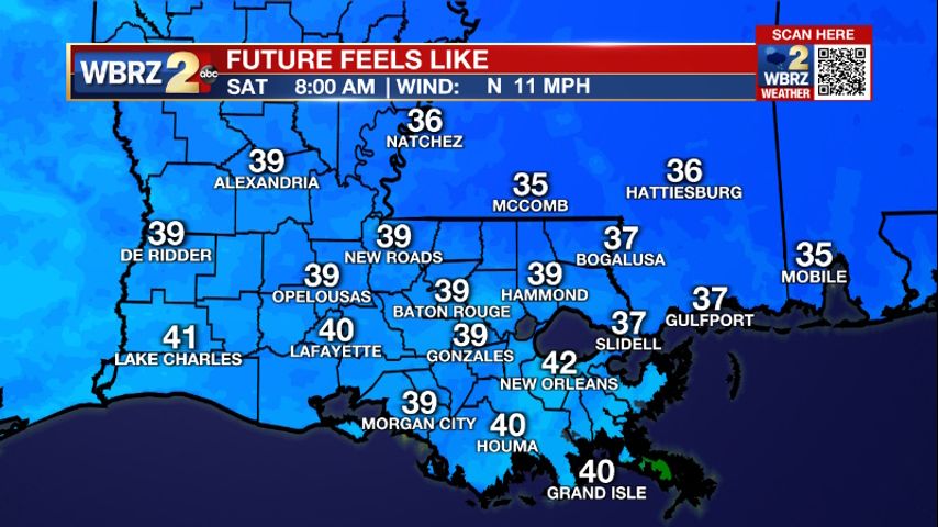 Up Next: With a secondary cold front through and clearing skies, Sunday morning will start off even colder with lows in the upper 30s. Sunshine will guide afternoon highs back to the mid 50s. With an even calmer and clearer night ahead, there is an increasing chance for a freeze, especially north of I-10 into Monday morning. It will be close enough that you should make plans to protect sensitive plants since the growing season has started. Gradual warming is expected through next week with minimal rain chances.