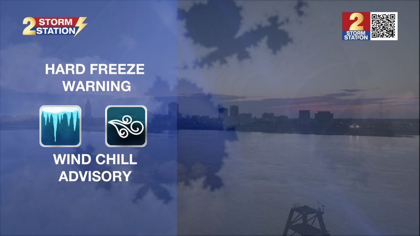 A ***HARD FREEZE WARNING*** is in effect Friday night into Saturday morning for parishes and counties north of Interstates 10/12. This includes all viewing area parishes and counties except Assumption and St. Mary. Below freezing temperatures in the upper teens and lower 20s will cause conditions that could kill crops, other sensitive vegetation and possibly damage unprotected outdoor plumbing.