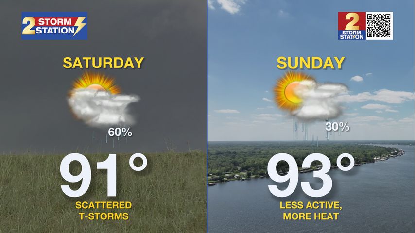 Up Next: Sunday and into the workweek, drier air will filter in as high pressure builds. Rain coverage will fall into the isolated or spotty category through at least Tuesday, and many of us might not see any rain at all. That comes with a tradeoff, though—temperatures will heat up into the low to mid 90s, and heat index values could hit or exceed 105°, especially Monday and Tuesday.