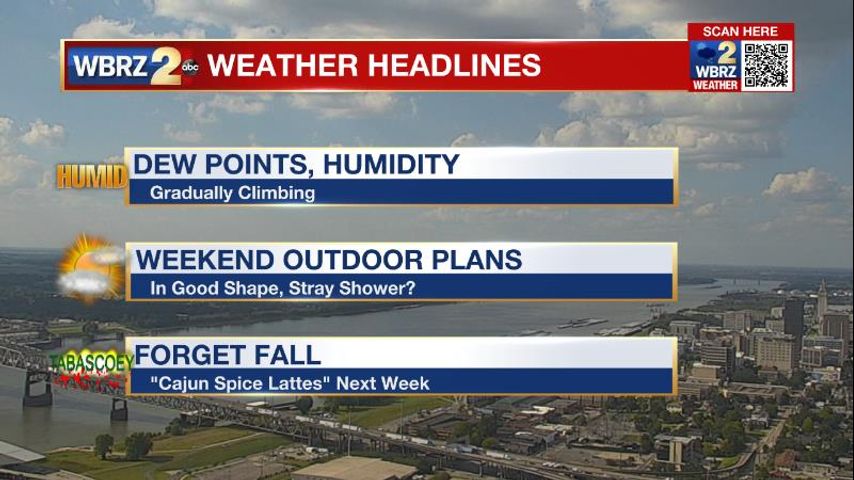 Next 24 Hours: Skies will stay mainly clear overnight with low temperatures taking one last run at the upper 60s. The slow return of humidity will continue on Saturday. With partly sunny skies, high temperatures will chug into the low 90s. A stray shower or thunderstorm is possible along and south of I-12 but the best chance for any rain will be immediately along the coast. Any precipitation will be short-lived.