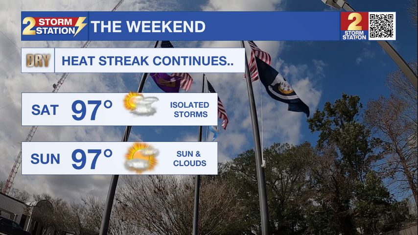 Tonight & Tomorrow: Any lingering storm activity will begin to dissipate by nightfall Friday, with clearing skies throughout the night. Saturday morning will see temperatures around the region in the middle to upper-70's before sunrise. Once the sun is up, temperatures will quickly climb, nearing the lower 90's by mid morning and into the upper-90's by early afternoon. Baton Rouge will see a high temperature near 97° Saturday with mostly to partly sunny skies. Besides a quick isolated storm Saturday afternoon, conditions will be mainly dry throughout the day.