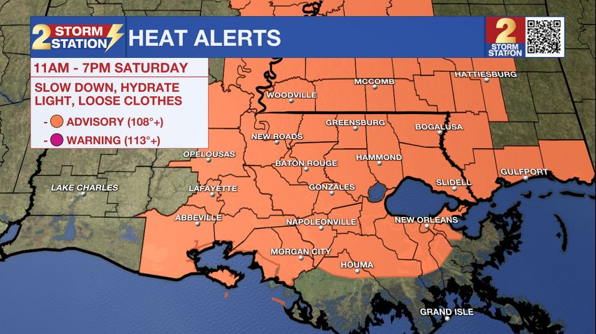 A *HEAT ADVISORY* is in effect from 11am to 7pm Saturday as feels-like temperatures up to 112 are expected across the entire Storm Station Forecast Area. Hot temperatures and high humidity may cause heat illnesses. Drink plenty of fluids, and when possible, stay in an air-conditioned rooms, avoid afternoon sun, and check up on relatives and neighbors.