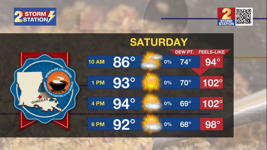 Tonight & Tomorrow: Similar to recent nights, low cloud development also will be possible on Friday night. This will help keep temperatures very warm, with a low near 78° in Baton Rouge. Keep in mind that the record warmest low temperature for Saturday is 77°. If we do not dip below that, we would set a new record.