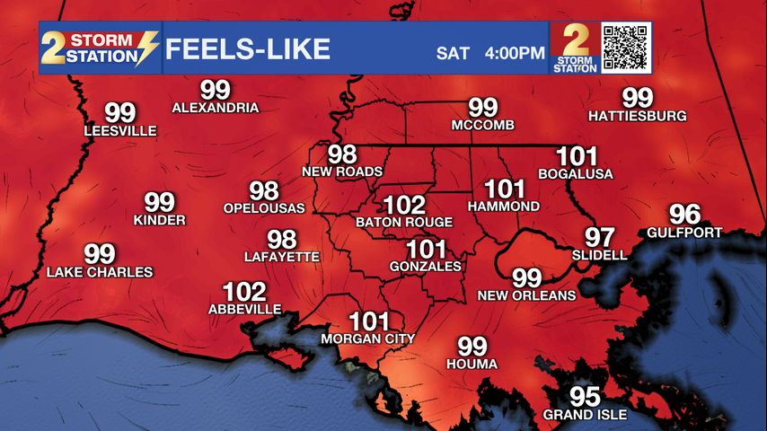 Tonight & Tomorrow: Any leftover showers will gradually wrap up through the evening. For WBRZ’s Fireworks on the Mississippi, expect clearing skies with temperatures falling into the low 80s. The rest of the night will feature mainly clear skies with a low in the mid 70s. It will be hard to find many spotty showers and thunderstorms on Saturday. A lot of sunshine is expected. Expect highs in the mid-90s. Enough humidity will be present to cause heat index values near 105 degrees at times. Stay hydrated and take breaks in the shade or air conditioning if enjoying time outside.