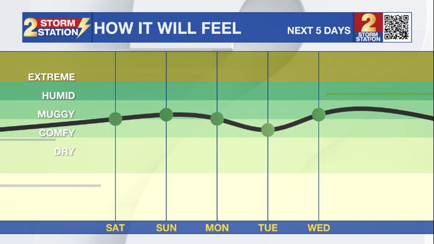 Up Next: This weekend is shaping up to be a hot and humid one with mostly dry conditions. Some rain will be possible Monday into Tuesday, but these days are unfortunately trending drier. Coastal areas have the best shot at rain on these days. Potentially record breaking temperatures then return by the middle of next week.