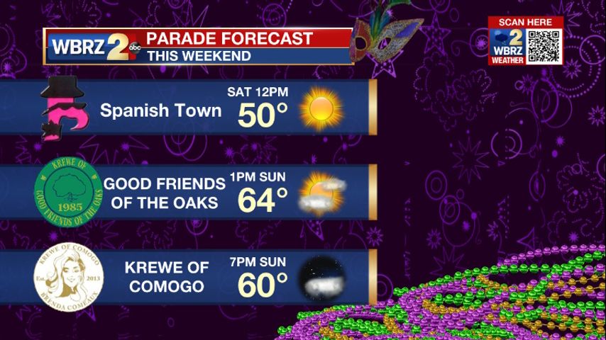 Krewe of Good Friends of the Oaks, Sunday at 12pm -- Mostly sunny with temperatures rising through the 60s.