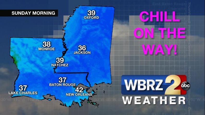 Up Next: The coolest temperatures so far this fall season are anticipated on Sunday morning when lows hit the upper 30s. Especially north of I-12 and away from cities and towns, some patchy frost is possible. Be sure to cover up or move sensitive plants before going to bed. With lighter winds and some sun, highs will return to the mid 60s on Sunday. Yet another weak cold front on Sunday night will keep highs in the 60s through Monday. Moderating temperatures and dry conditions will continue until another front arrives around next Thursday with the next chance of showers. CLICK HERE for your full 7-Day Forecast.