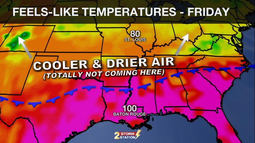 Up Next: The front is expected to diminish somewhere between I-10 and the coast by Sunday. While significant changes are not expected, some slightly drier air will work into the atmosphere and put a limit on the development of showers and thunderstorms Sunday and Monday. Not to say it will be completely dry, but rain coverage will be more spotty or isolated in nature. As far as any changes we will sense otherwise, there is not much to get excited about. Some of that drier air in the atmosphere could mix down to the surface just enough to keep humidity from putting us in heat alert levels.