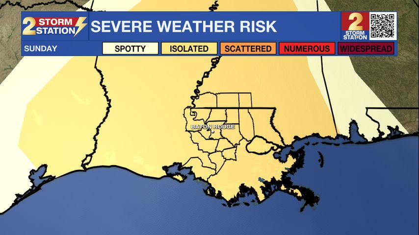 Up Next: The next weather impact will arrive on Sunday as a strong cold front rolls through. Before that, high temperatures will jump well into the 70s. A few showers will be possible through the morning and afternoon, but some breaks of sunshine are equally likely. Widespread rain and thunderstorms will arrive during the evening. Most of the Metro Area, especially those north and west of Baton Rouge are in a Level 2/5 “slight risk” of severe weather. Primarily along a line of thunderstorms, gusty winds and a brief tornado will be possible. Due to the fast moving nature of the storm line, not much more than an inch of rain is expected out of this system. At worst, there could be some short-fused poor drainage flooding.