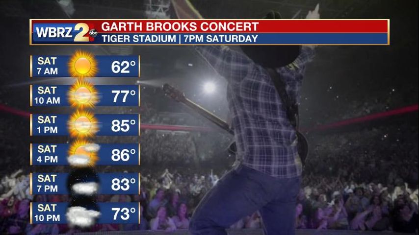 Garth Brooks: For those heading out to the concert on Saturday evening, the weather looks good. If you are arriving early to tailgate, expect temperatures to climb out of the 70s and into the 80s before noon. A high of around 86 degrees is expected during the mid-afternoon. A stray shower is not out of the question but, if one can even develop, it would be short-lived. Into the evening hours, expect mostly clear skies and it will feel muggy as thermometers fall out of the 80s into the 70s by 9pm.