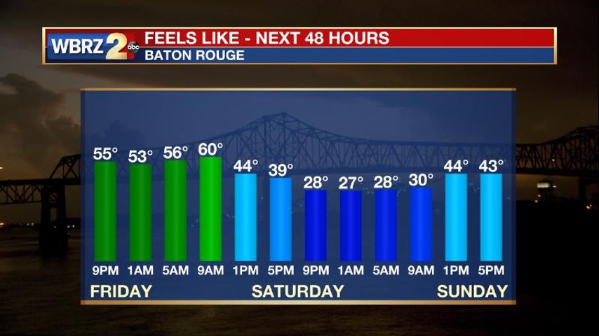 Up Next: Behind the cold front, northwest winds of 10-20mph, and gusts over 30mph, will continue ushering in much colder air into Sunday morning. While low temperatures will be in the 30s as the day begins, wind chills will be in the 20s. Afternoon high temperatures will struggle to reach the mid 40s with wind chills in the 30s. Especially early, cloud cover will linger with just enough moisture for some sprinkles or possibly even snow flurries, mainly north and east of Baton Rouge. Any flying flakes will be isolated and not stick. As winds lighten and skies clear, low temperatures will then get close to freezing on Monday morning. Sunshine will push high temperatures back into the 50s during the afternoon. Tuesday will remain dry and turn milder before the next cold front arrives late Wednesday. CLICK HERE for your detailed 7-Day Forecast.