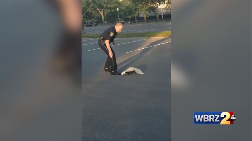 Frightened skunk with yogurt cup stuck on its head sprays police officer