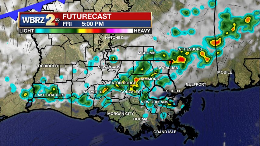 Next 24 Hours: Overnight should remain quiet and muggy with mostly clear skies and low temperatures in the low 70s. An ongoing line of showers and thunderstorms will be weakening on approach to the Baton Rouge area near daybreak. It is possible some lighter rain holds on, but for the most part, the first half of Friday should be dry. Some sunshine will push high temperatures into the upper 80s. Clouds will increase into the afternoon hours as a cold front enters northwest Louisiana. Another line of showers and thunderstorms will race out ahead of the boundary and move through during the afternoon and evening hours. Any thunderstorms could briefly become strong with downpours and gusty wind. Those showers and thunderstorms could linger into the evening but the loss of daytime heat should cause them to wane.