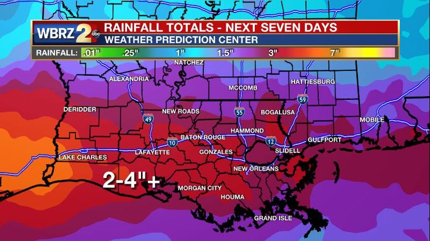 Up Next: By Friday, a cold front will move into north Louisiana and central Mississippi. With deep, tropical moisture pooling south of it, the boundary will be responsible for an uptick in showers and thunderstorms. Though it is a little early to call the weekend a washout, multiple rounds can be expected each day through Sunday. Some downpours and therefore localized flooding could become an issue. At this time, 2 to 4 inches of rain are expected through next Tuesday. The cold front will dissipate after that. The recent, regular pattern of late morning to late afternoon showers and thunderstorms will return for the middle of next week as we watch what is happening in the tropics to our east. CLICK HERE for your full 7-Day Forecast.