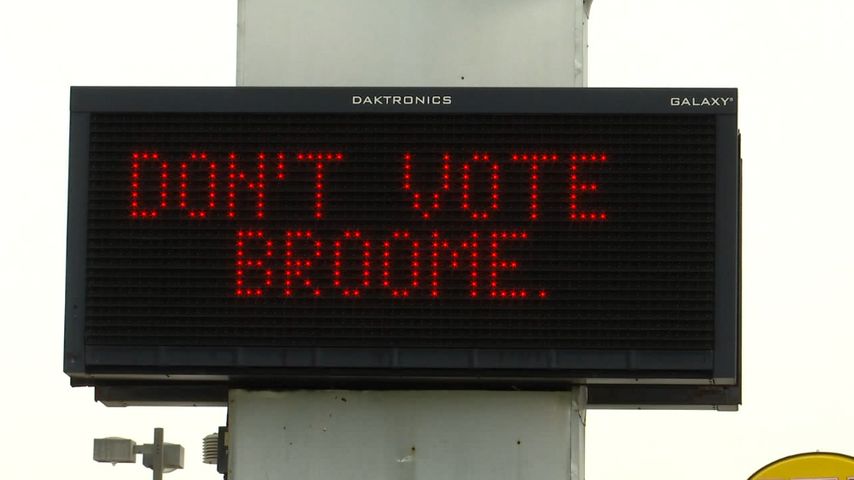 The sign says, "Mayor Broome, I thought you were supposed to be getting rid of the homeless and the trash. I'm not seeing any of that, it has gotten ridiculous. Don't vote Broome!"